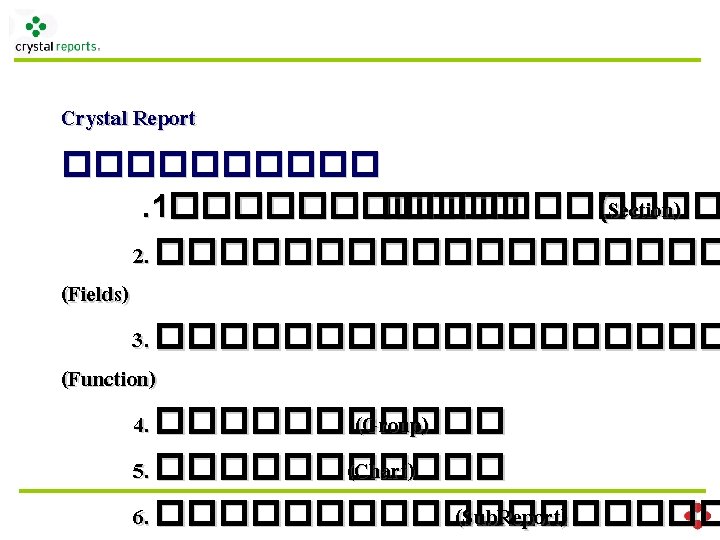Crystal Report Vesion • Crystal Report 4. 6 • Crystal Report 7 • Crystal Report 8. 5 • Crystal Report 9 • Crystal Report 10 • Crystal Report 11 • Crystal Report 2008 • Crystal Report 2011