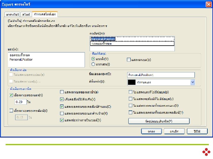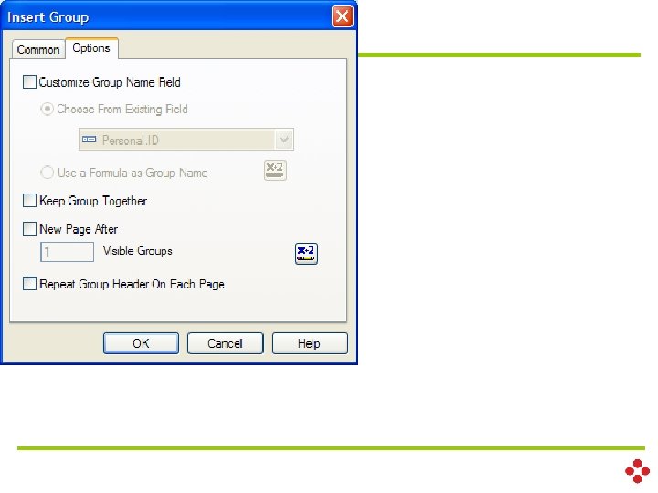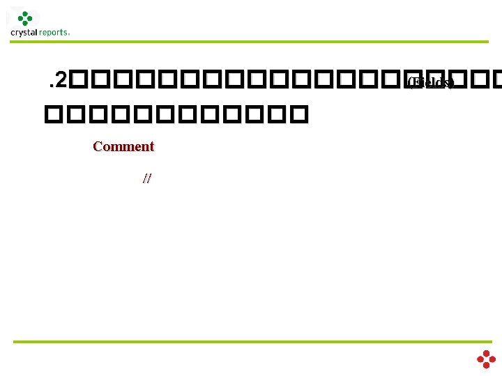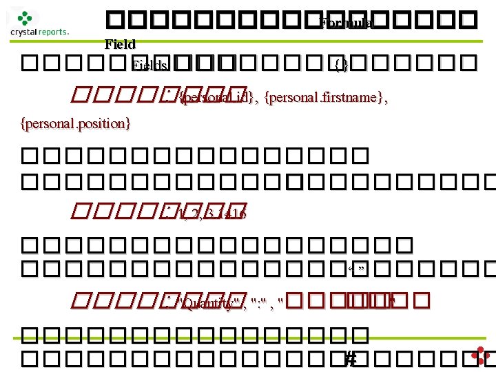 ������������ (Fields) -Database Fields ����� Database {table. Name. field. Name} - Formula Fields ��������� {@formula. Name} - Parameter Fields ��������� {? parameter. Name} - Running Total Fields ��������� � {#running. Name} - SQL Expression Fields ��������� SQL {%sql. Name} - Group Name Fields ��������� � ��������� (���� Function) - Special Fields ������� �