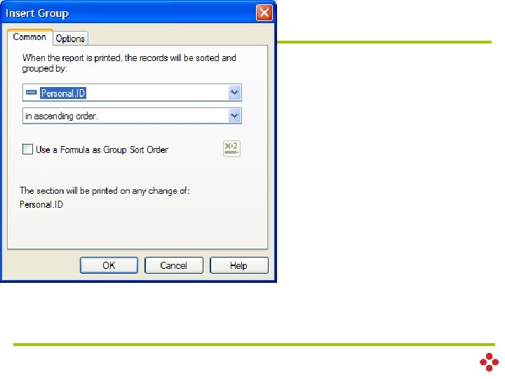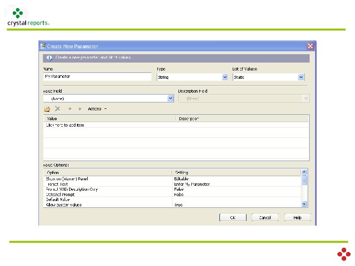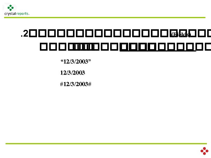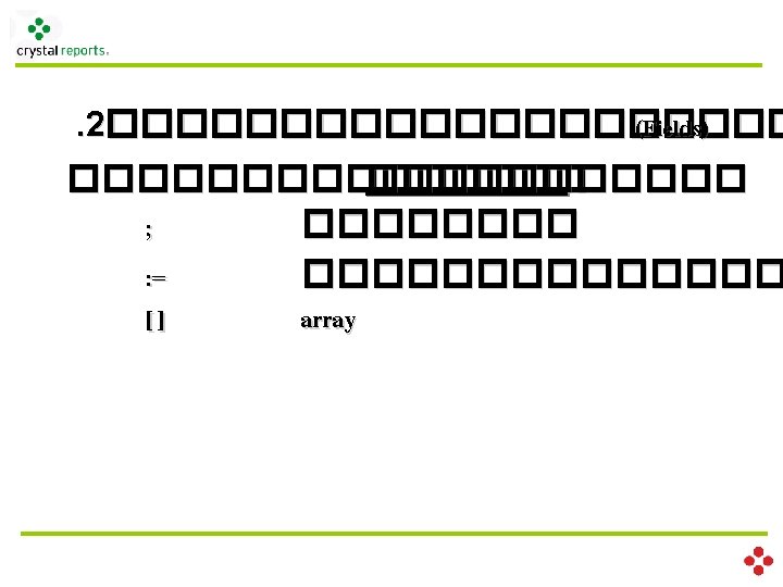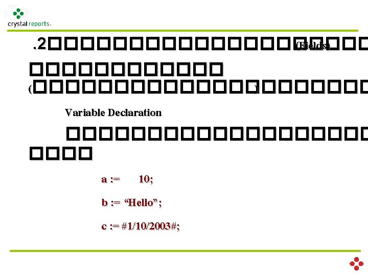 . 2������������ (Fields) ������ (��������� ) Variable Declaration scope type var_name Scope Local ������� Formula �������� Global ����� Formula ���������� Shared ����������� type Boolean. Var Number. Var Currency. Var Date. Var Time. Var Date. Time. Var