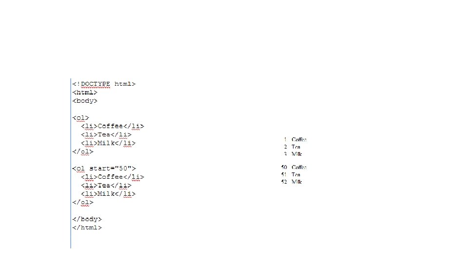 HTML Lists <OL TYPE = “A”, “a”, “I”, “i”, or “ 1” Type of label for items START = n> Starting value for labels <LI> … </OL> An ordered list can only contain LI elements.