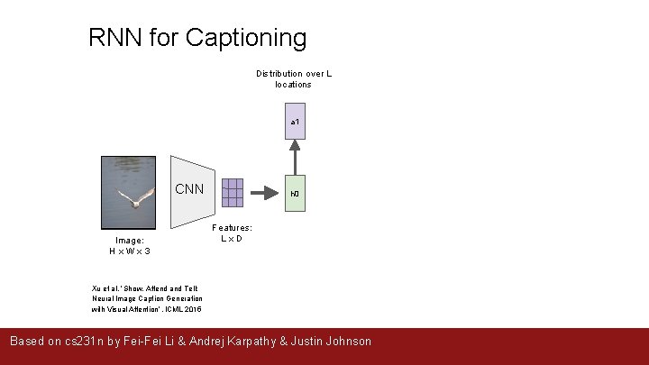 RNN for Captioning CNN Image: H x W x 3 Features: L x D Xu et al, “Show, Attend and Tell: Neural Image Caption Generation with Visual Attention”, ICML 2015 Based on cs 231 n by Fei-Fei Li & Andrej Karpathy & Justin Johnson