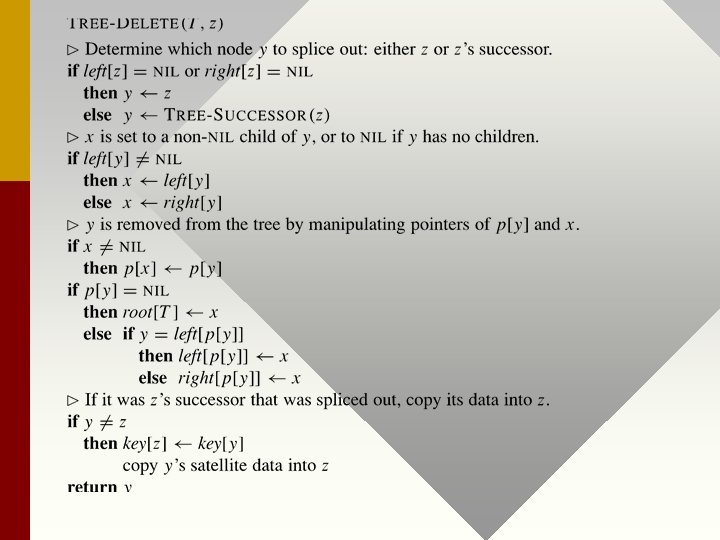 Do example trace for three cases of algorithm. See code next slide. Note: the above swap could also be done with predecessor. Runtime of Delete operation ?