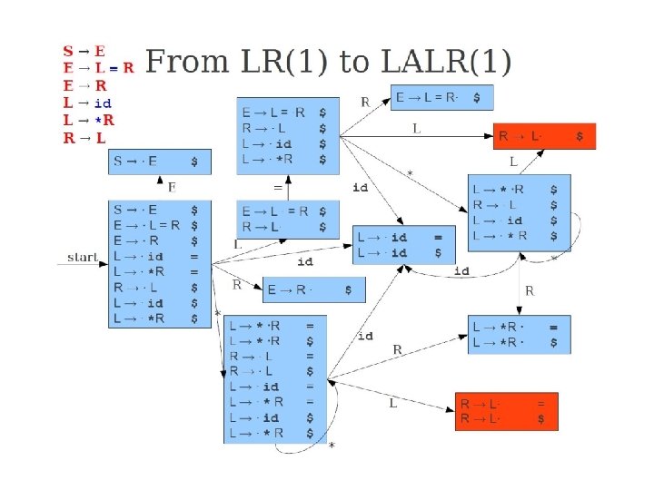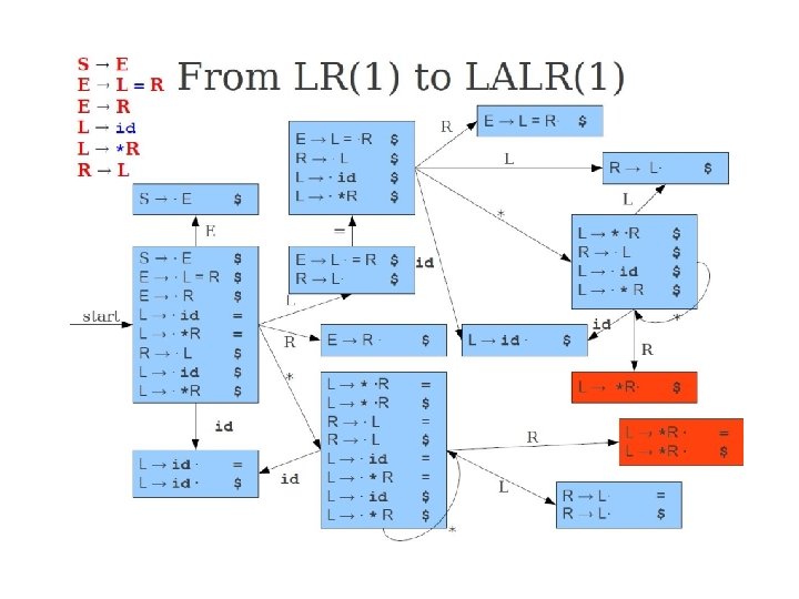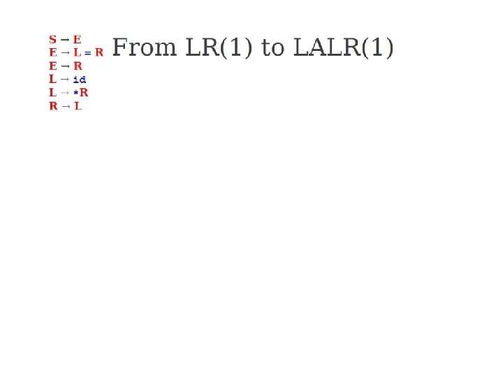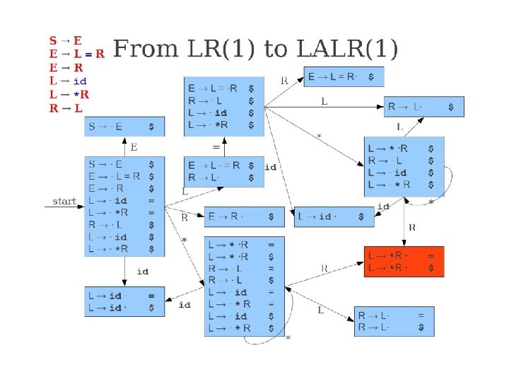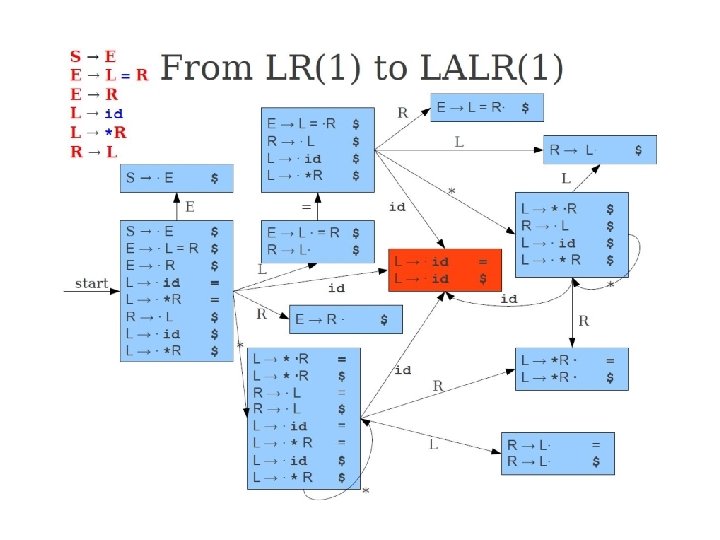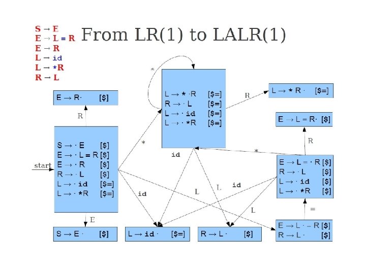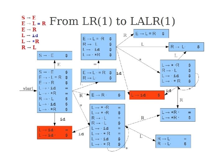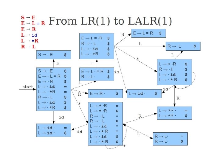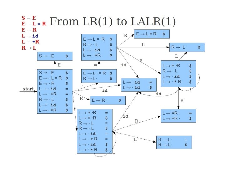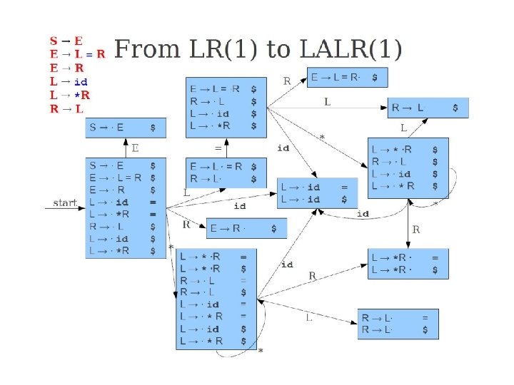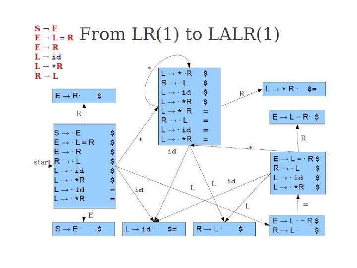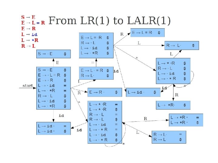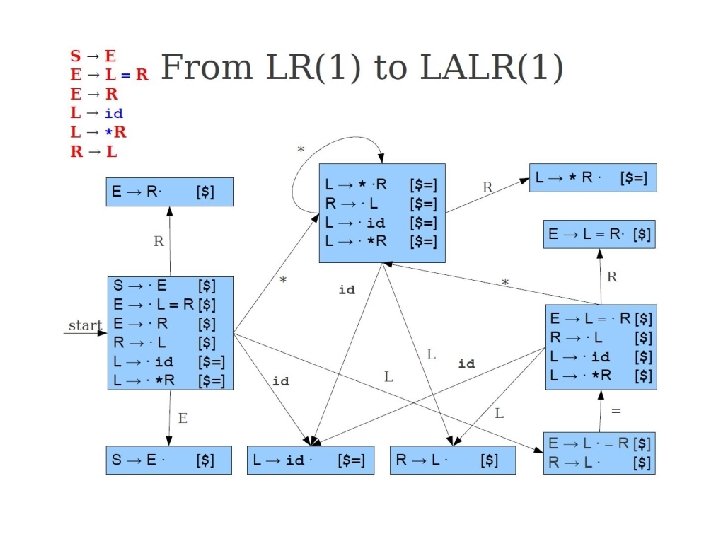 Review of LR(1) ● Each state in an LR(1) automaton is a combination of an LR(0) state and lookahead information. ● Two LR(1) items have the same core if they are identical except for lookahead.