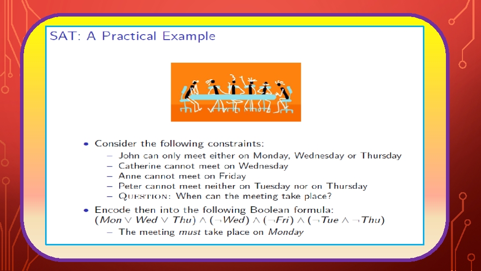SATISFIABILITY EXAMPLE • F = (x 1 V x 2) (x 1 V x 3 V x 4 V x 5) ( x 2) (x 2 V x 5) ( x 1) (x 1) 12