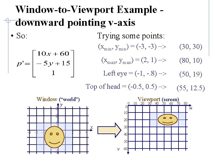 Window-to-Viewport Example downward pointing v-axis • So: Trying some points: (xmin, ymin) = (-3, -3) -> (xmax, ymax) = (2, 1) -> Left eye = (-1, -. 8) -> Top of head = (-0. 5, 0. 5) -> Window (“world”) 3 y 0 10 2 20 1 -4 -3 -2 -1 0 -1 -2 -3 x 1 2 3 30 4 40 50 v 60 0 10 Viewport (screen) 20 30 40 50 60 70 80 u