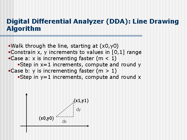 Digital Differential Analyzer (DDA): Line Drawing Algorithm §Walk through the line, starting at (x 0, y 0) §Constrain x, y increments to values in [0, 1] range §Case a: x is incrementing faster (m < 1) §Step in x=1 increments, compute and round y §Case b: y is incrementing faster (m > 1) §Step in y=1 increments, compute and round x (x 1, y 1) dy (x 0, y 0) dx