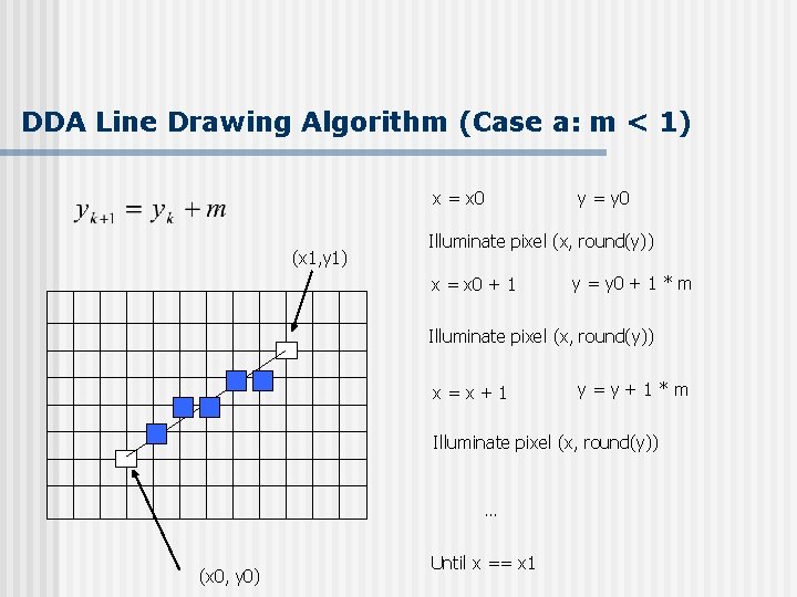 DDA Line Drawing Algorithm (Case a: m < 1) x = x 0 (x 1, y 1) y = y 0 Illuminate pixel (x, round(y)) x = x 0 + 1 y = y 0 + 1 * m Illuminate pixel (x, round(y)) x=x+1 y=y+1*m Illuminate pixel (x, round(y)) … (x 0, y 0) Until x == x 1