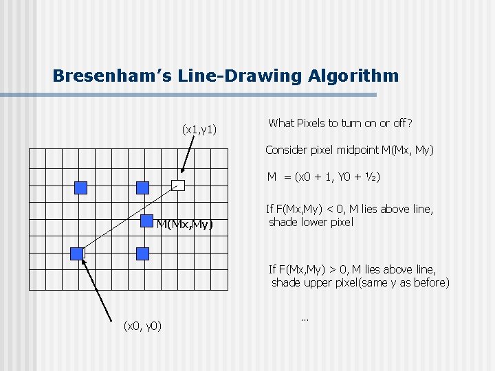 Bresenham’s Line-Drawing Algorithm (x 1, y 1) What Pixels to turn on or off? Consider pixel midpoint M(Mx, My) M = (x 0 + 1, Y 0 + ½) M(Mx, My) If F(Mx, My) < 0, M lies above line, shade lower pixel If F(Mx, My) > 0, M lies above line, shade upper pixel(same y as before) (x 0, y 0) …