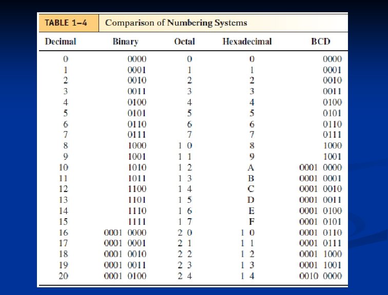Hexadecimal Numbering System (Base 16) n 16 allowable digits. n n Each hex digit represents a 4 -bit group n n 0, 1, 2, 3, 4, 5, 6, 7, 8, 9, A, B, C, D, E, and F See Table 1 -3 Two hex digits are used to represent 8 bits are called a byte n 4 bits are called a nibble n 15