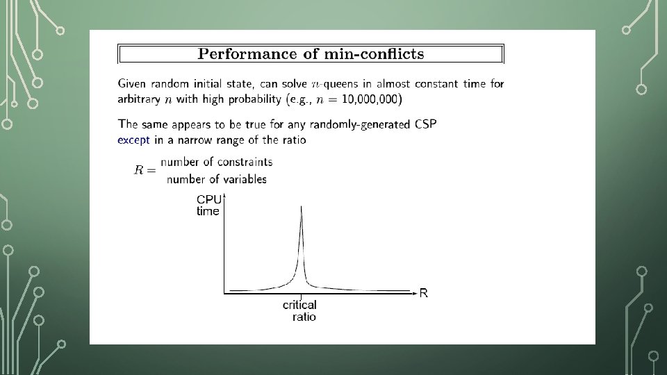 LOCAL SEARCH FOR CSP function MIN-CONFLICTS(csp, max_steps) return solution or failure inputs: csp, a constraint satisfaction problem max_steps, the number of steps allowed before giving up current an initial complete assignment for csp for i = 1 to max_steps do if current is a solution for csp then return current var a randomly chosen, conflicted variable from VARIABLES[csp] value the value v for var that minimize CONFLICTS(var, v, current, csp) set var = value in current return failure