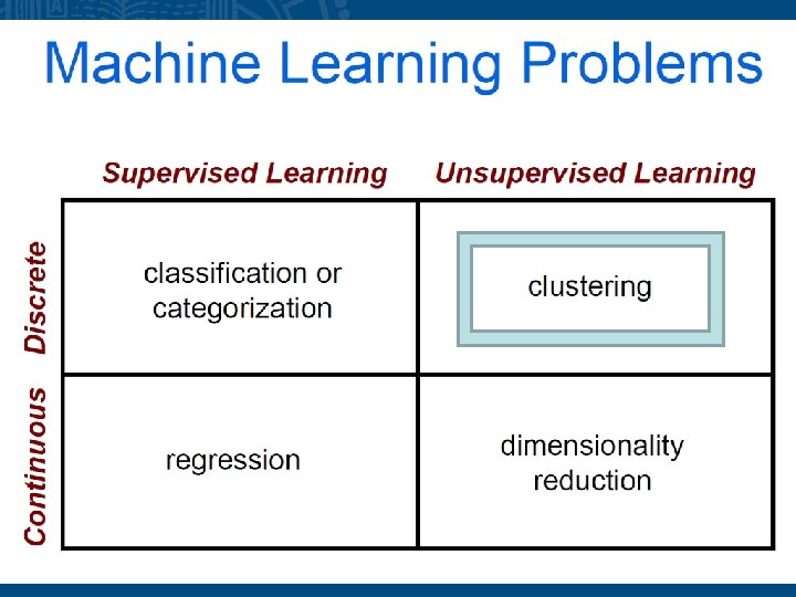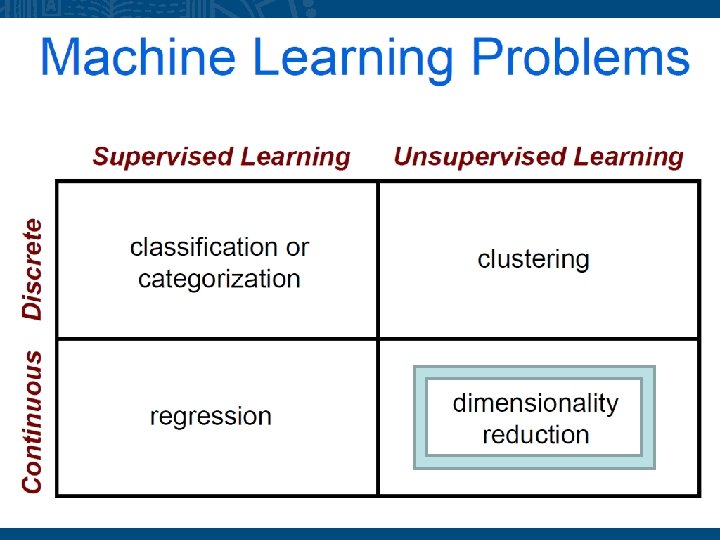 Dimensionality reduction • Principal component analysis (PCA) is the most important technique to know. It takes advantage of correlations in data dimensions to produce the best possible lower dimensional representation, according to reconstruction error. • PCA should be used for dimensionality reduction, not for discovering patterns or making predictions. Don't try to assign semantic meaning to the bases. • Independent component analysis (ICA), Locally liner embedding (LLE), Isometric mapping (Isomap), …