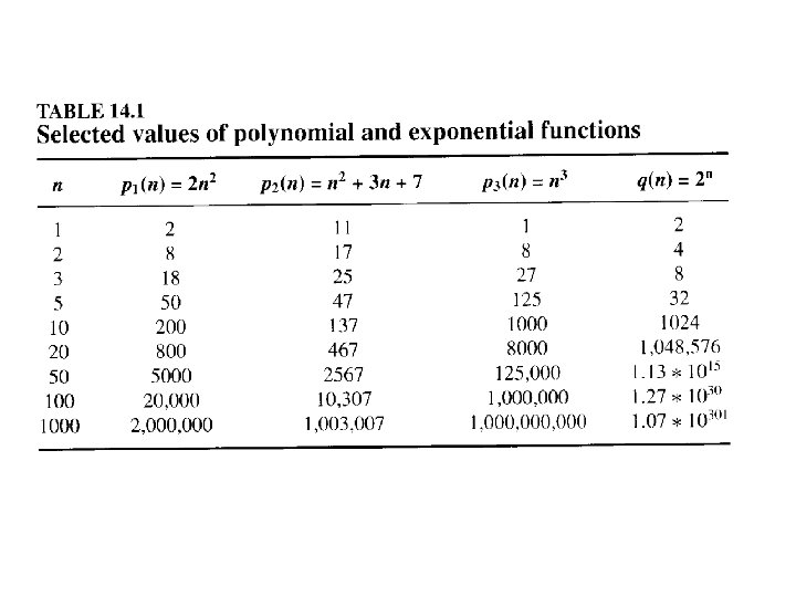 Polynomial vs. exponential As you can see, there are some differences in how fast functions of different polynomials expand. The n 3 function gets bigger faster than either of the n 2 functions; its growth rate is bigger. However, these differences are insignificant compared to the differences between the any of the polynomial functions and the exponential function. For large values of n, 2 n is always greater than n 2. So usually we just lump all of the polynomial functions together, and distinguish them from the exponential functions.