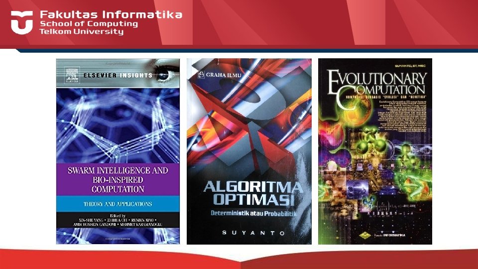 Daftar Pustaka 1. Suyanto, Swarm Intelligence: Komputasi Modern untuk Optimasi dan Big Data Mining, Dalam proses di Penerbit Informatika, Bandung, 2017 2. Yang, X. -S. , Cui, Z. , Xiao, R. , Gandomi, A. H. , Karamanoglu, M. , 2013. Swarm Intelligence and Bio-inspired Computation - Theory and Applictions. Elsevier. 3. Suyanto, Algoritma Optimasi: Deterministik atau Probabilistik? , Graha Ilmu, Yogyakarta, 2010 4. Suyanto, Evolutionary Computation: Komputasi Berbasis `Evolusi’ dan `Genetika’, Informatika, Bandung, 2008