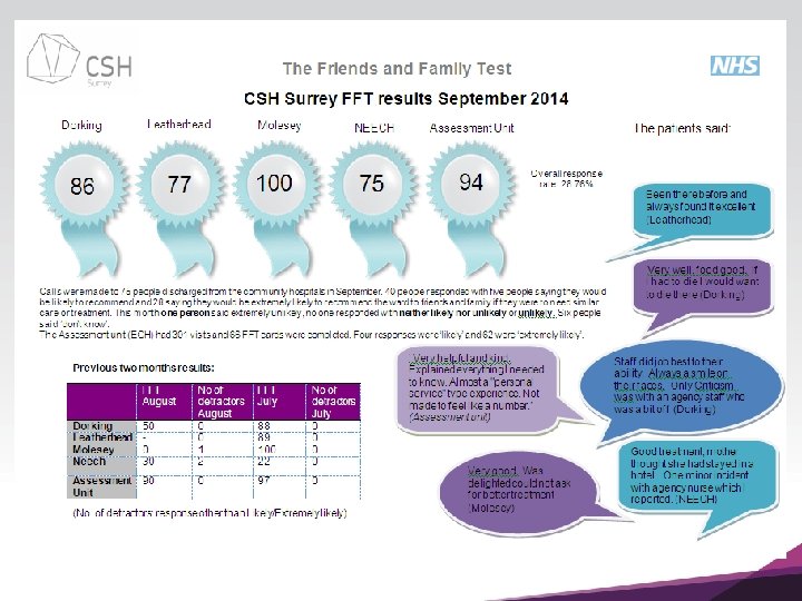 CSH Surrey or Mid Staffs? I have to say my recent experience leaves me with nothing but admiration for the hospital and all of its staff, could not fault it on any level. Absolutely the best treatment from the best people and it couldn't have been any better if I had gone privately. Even the other patients in my ward were lovely and we are going to keep in touch! Staff did job to the best of their abilities. Always a smile on their faces. Only criticism was of an agency staff who was a bit off. Very Good! Was delighted, could not ask for better treatment! I have only praise for the hospital, My mum is back in again and the staff on the ward have been great, just as they were last time. They allowed us to stay on after visiting ended so that we could stay with her as she was so agitated. She was much calmer when I left. The staff are always very friendly and make the effort to remember you on follow up appointments. The ward is clean, as is the hospital. You are made to feel welcome and not a nuisance. Very well, food good. If I had to die I would want to die there.