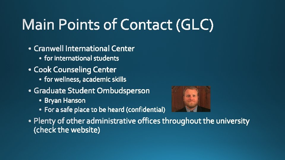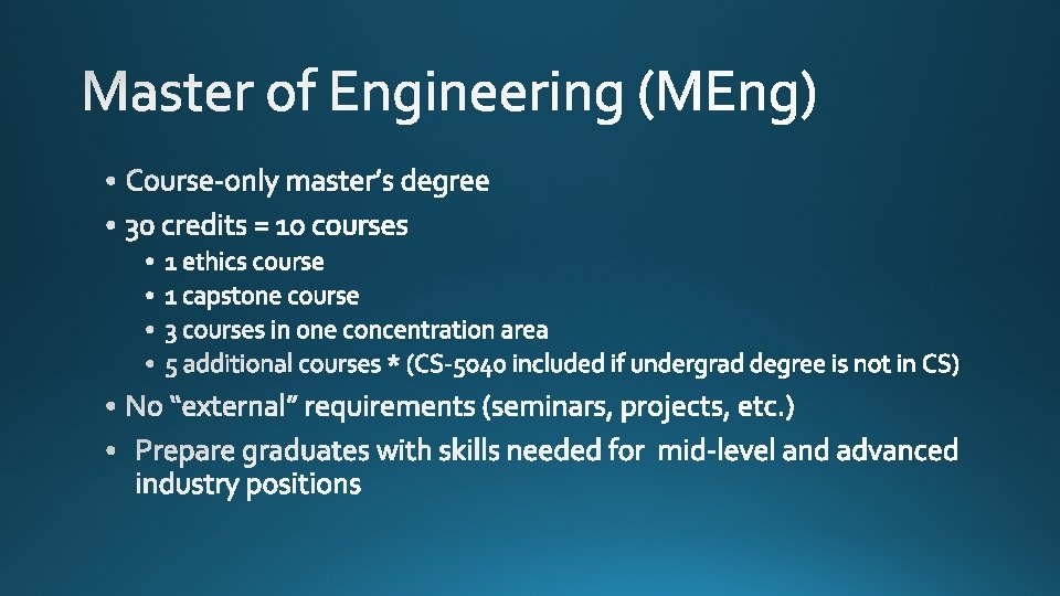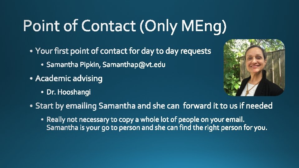Dr. Shaffer Associate Department Head for Graduate Studies Dr. Hooshangi MEng Program Director Department paperwork Approvals Dr. Ribbens Dwight Barnette Department Director, Academic Head Operations Sharon Kinder -Potter Samantha Pipkin Teaching Assistants Dr. Shaffer Initial Graduate Advisor Advice Day-to-day