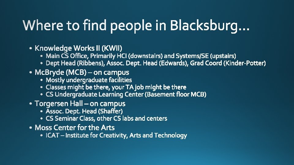 Sharon Kinder -Potter skpotter@vt. edu Dr. Ribbens Dr. Shaffer Dwight Barnette YOU Init. Grad. Advisor shaffer@vt. edu Graduate Handbook https: //cs. vt. edu/Graduate. html Dept. Head Policy questions ribbens@vt. edu Samantha Pipkin Dir. Acad. Ops. samanthap@vt. edu Dr. Hooshangi Teaching Assts. barnette@vt. edu Grad. Coord. All admin MEng Advisor shoosh@vt. edu