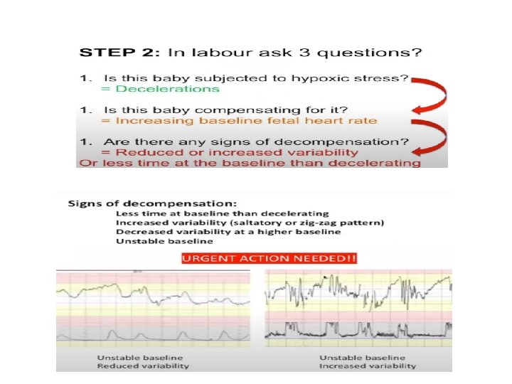 Cont , , • Early / type I / mirror image decelerations – They occur as a result of contractions and head compression – Benign but if persists >60 minutes (reassess) , >90 minutes (no adequate time to recover) – Reassure the mother • delayed/ late/ type II: – fetal distress • variable – Contractions are different in relation , size or duration – Cord compression – Just change the position of the mother