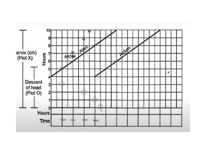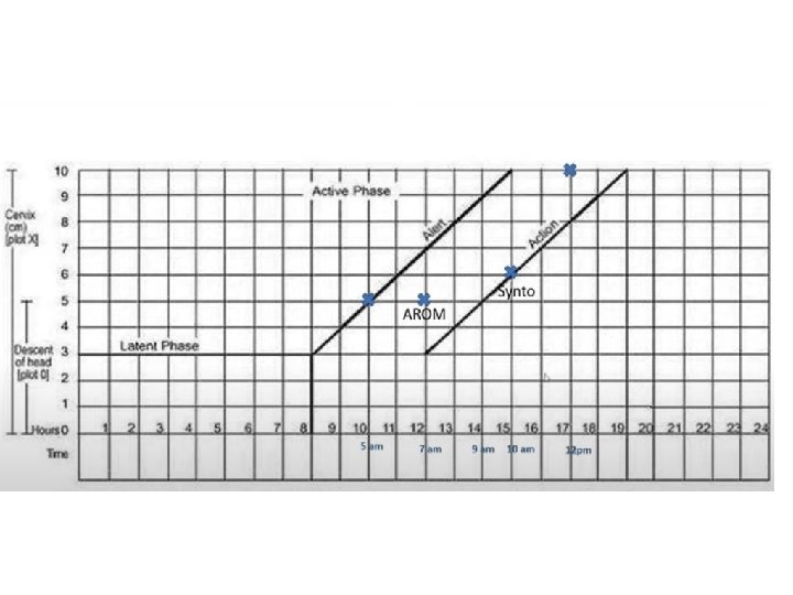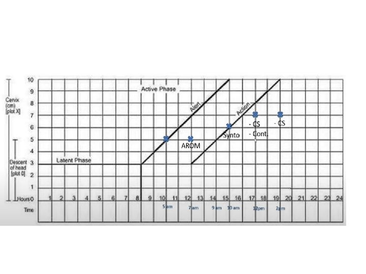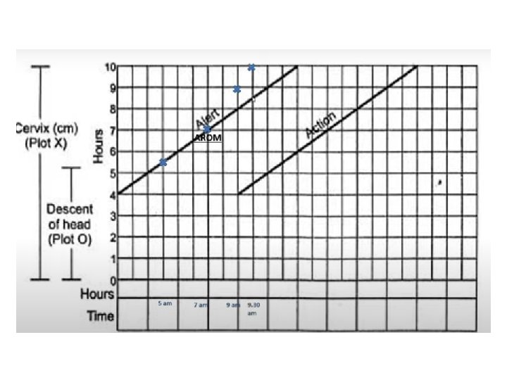Cont, , • The Alert line starts at 4 cm of cervical dilatation and it travels diagonally upwards to the point of expected full dilatation (10 cm) at the rate of 1 cm per hour. • The action line is located 4 hours to the right of the alert line. • As slope is to the left side of the alert line everything is ok • Cervical dilatation represents the active phase • Descent represents the second stage
