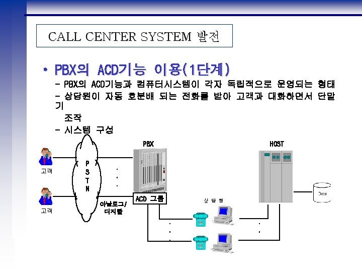 CALL CENTER SYSTEM 발전 • PBX의 CTI Link 접속 및 부가기능 부여(3단 계) 고객 고객 PBX와 컴퓨터시스템 또는 IVR시스템이 CTI Link로 연결된 형태 발신자번호 자동인식에 의한 DB검색, 상담자료 제공가능 In/Out bound Call Blending IVR, ACS(Auto Calling Service), Fax Server CTI Server TAPI, TSAPI File/DB PBX Server CTI Link TAPI A 시스템구성 P P S T N CSTA TSAPI I LAN 아날로그/ 디지탈 IVR/FAX, Server Internet phone Gateway TAPI/TSAPI. . . TAPI/TSAPI INTERNET /INTRANET Bridge/ Router A P I E-mail 및 Web Server (UMS)