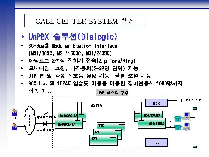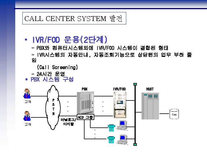 CALL CENTER SYSTEM 발전 * Un. PBX 시스템구성 - IVR자체 내선스위칭기능 이용(Un. PBX, PC-PBX, Communication Server) - CTI기능 보유 (ANI수신, Dialing, 내선상태 감시, 호전환, 3자통화, Monitoring, Coaching) IVR/FOD 고객 고객 P S T N SERVER . . . 아날로그/ 디지탈 가입자접속 LAN . . . HOST