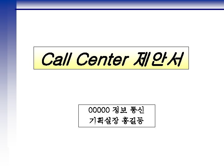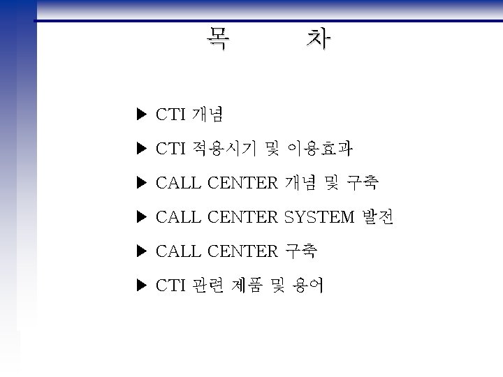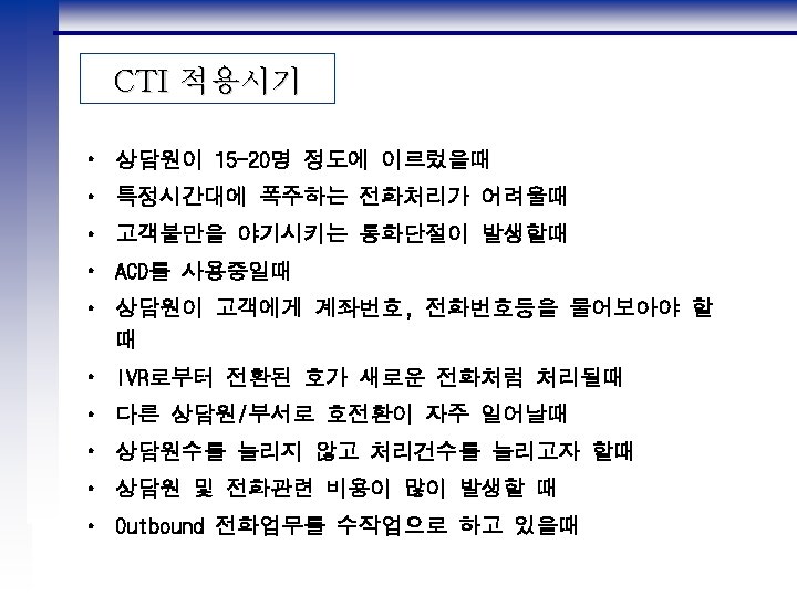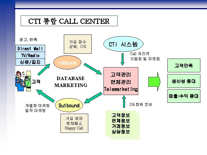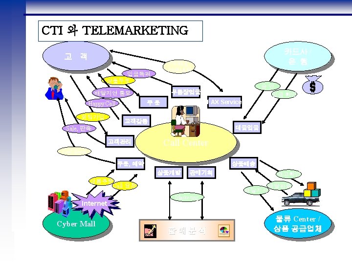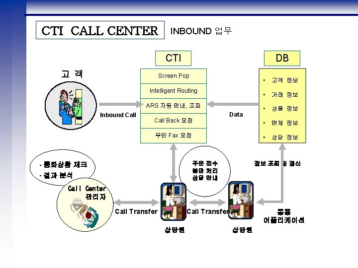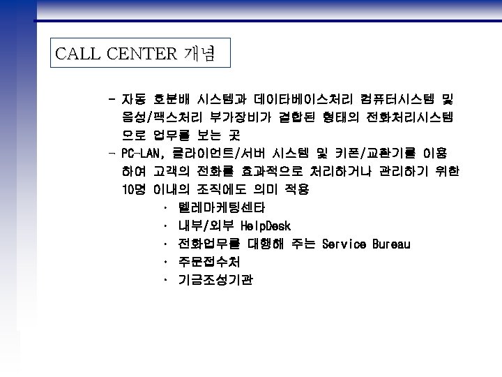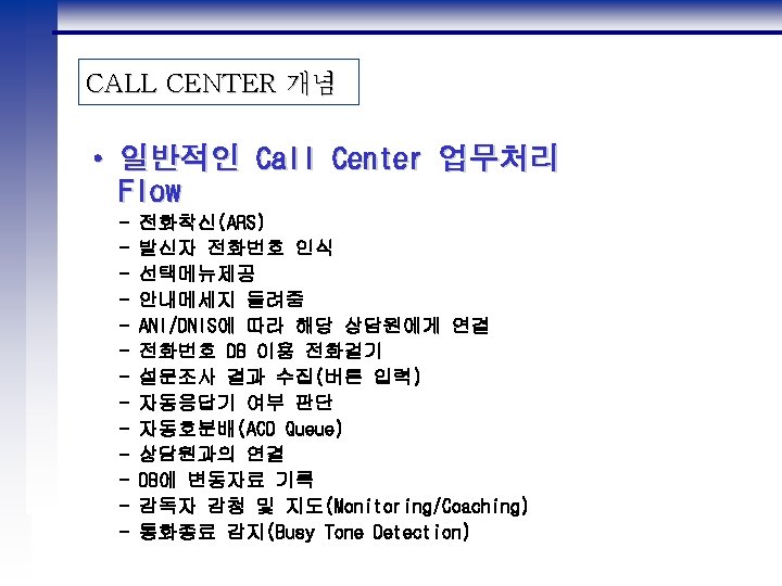 CALL CENTER 구축 • Call Center System 구성 - Computing System (HOST, Server/Client) Database, Application Program Telecommunication System (PBX/ACD, Key System) Voice/Fax Processing System(IVR, FOD, ACS, VMS) Data Networks • 업무흐름도 - 전화와 데이타처리를 위한 상세 흐름도 작성 • 운영환경 정의 - CTI관련 운영자별 업무처리 정의(업무분장, 감독자 기능) • Database 설계 - CTI기능과 관련된 각종 정보수집, 통계처리가 가능토록 DB설계 • 종합적인 성능개선 모델링