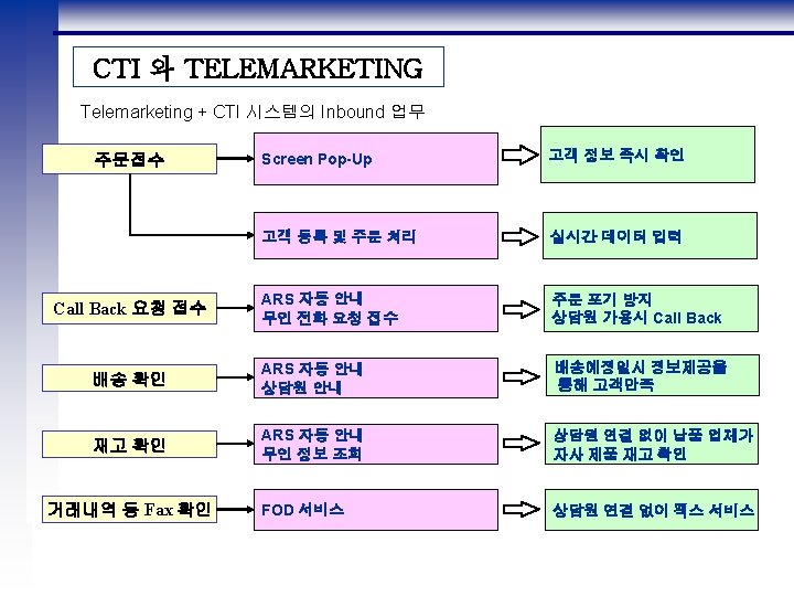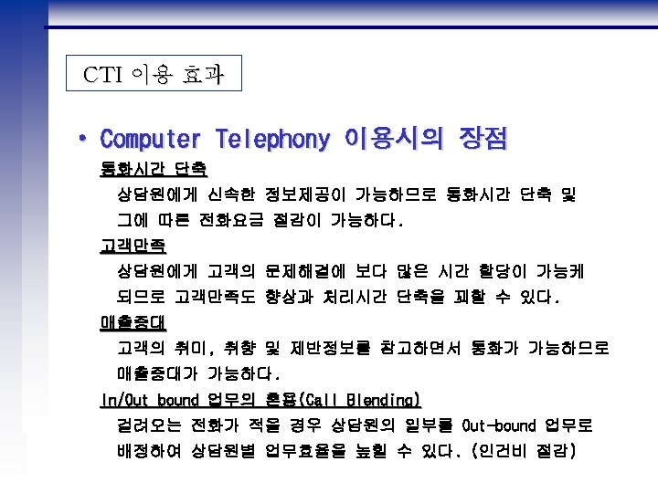 CTI 이용 주요시스템 • 자동음성안내(Audiotex, ARS) • 무인자동교환(Auto Call Attendant) • 음성/팩스사서함(VMS/FMS) • 자동전화발신(Auto Calling Service) • 팩스-온-디맨드(FOD) • 팩스서버 • 음성회의(Voice Conference) • 통합메세징시스템(UMS: Unified Messaging System) • 인터넷 폰/팩스 게이트웨이 • Call Center/Telemarketing Center • TTS, VR/ASR