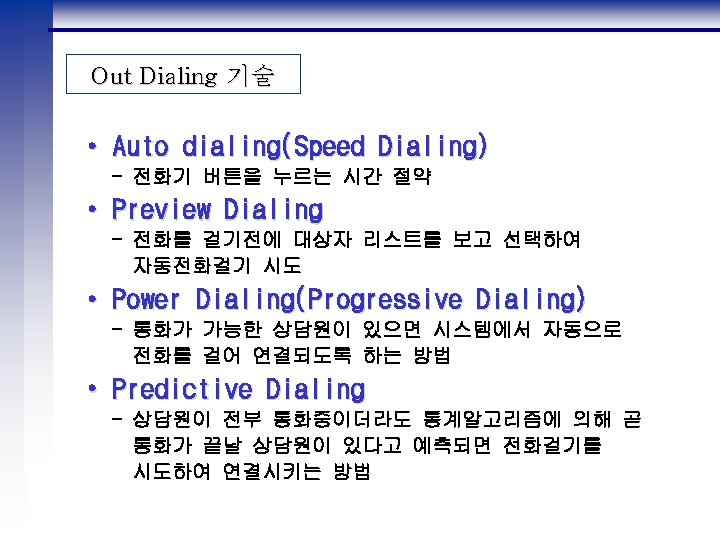 용어정리 ◈ ANI : Automatic Number Identification ◈ CLID : Calling Line ID ◈ DNIS : Dialing Number Identification Service ◈ SPI : Service Provider Interface ◈ WOSA : Windows Open Services Architecture ◈ NLM : Netware Loadable Modules ◈ CSTA : Computer Supported Telephony Application ◈ CTI : Computer Telephony Integration ◈ CIT : Computer Integrated Telephone ◈ P(A)BX: Private(Automatic) Branch Exchange ◈ ACD : Automatic Call Distributor ◈ VMS : Voice Mailing System
