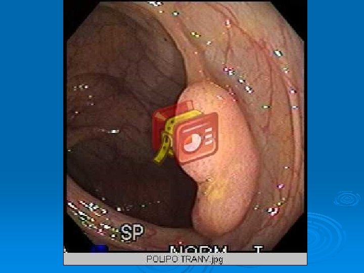 Pólipos adenomatosos de colon o recto Ø Ø Ø Entre 70 y 90% del cáncer de colon proviene de un pólipo Pólipos tubulares tienen menor potencial de malignización y los vellosos es mayor Pólipos mayores de 2 cm. tienen 50% de chance de neoplasia 15 a 30% de la población en USA desarrollará pólipos 15% de los pólipos son hiperplásticos y no se malignizan