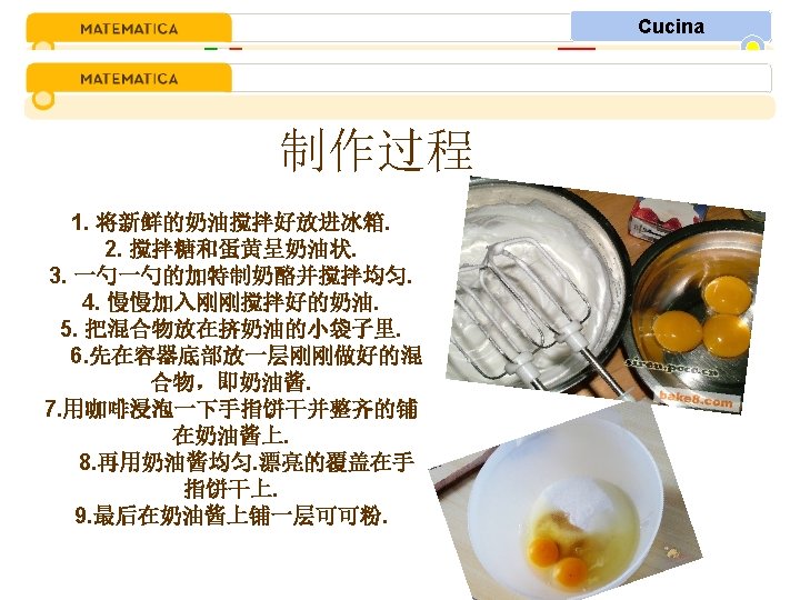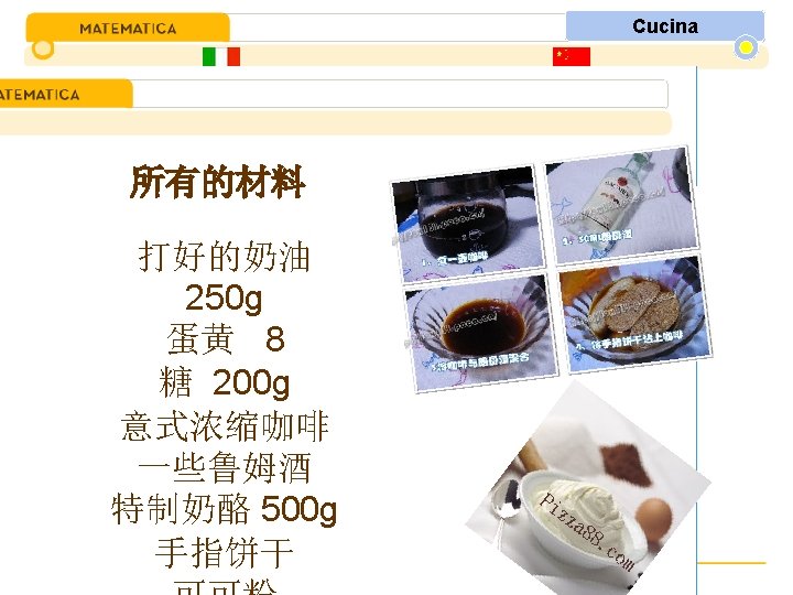 Cucina Tutti gli ingredienti Panna montata 250 g Tuorli 8 Zucchero 200 g Caffè espresso Un’po di rum Mascarpone 500 g Biscotti savoiardi Cacao a polvere