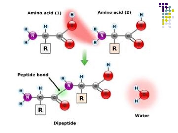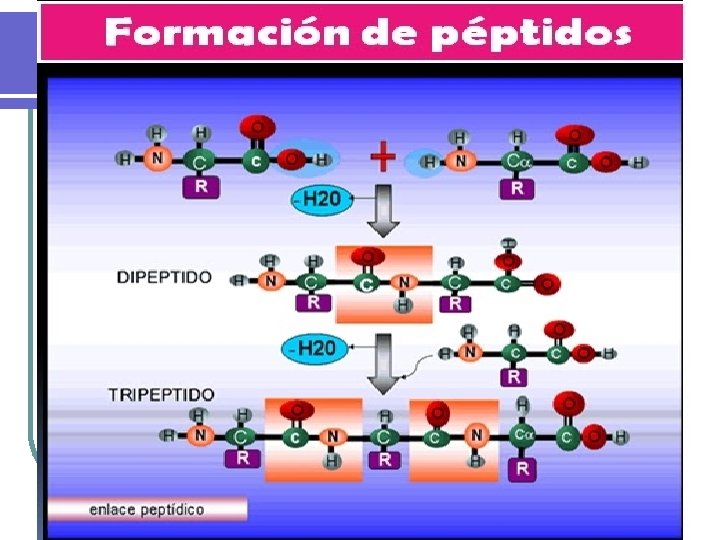 Péptido l Unión de aminoácidos por enlaces peptídicos. l A la unión de dos aminoácidos se le denomina dipéptido l Si son pocos residuos (menos de 10), oligopeptidos l Si son cadenas largas, polipéptidos