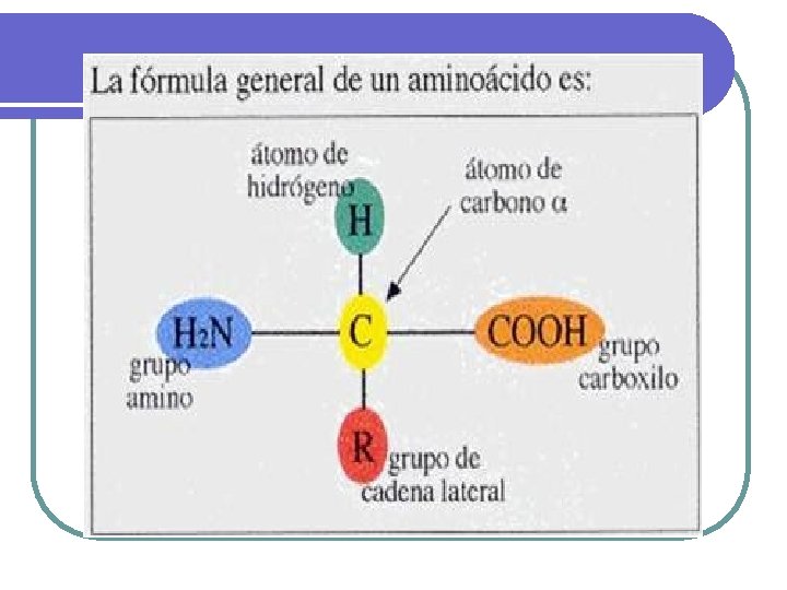 Aminoácidos Los aminoácidos están formados por un carbono unido a un grupo carboxilo, un grupo amino, un hidrógeno y una cadena R de composición variable, que determina las propiedades de los diferentes aminoácidos;