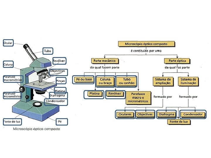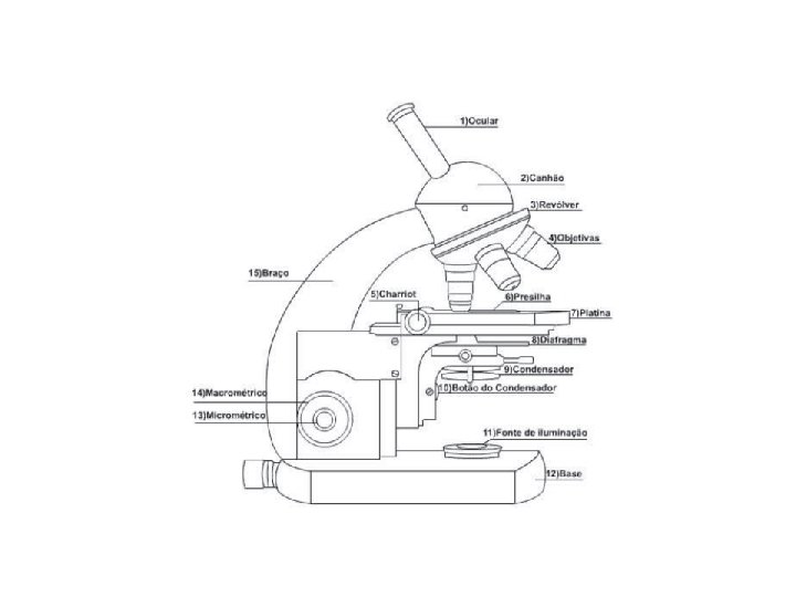 • Cuidados com o microscópio óptico F Não manusear o equipamento com as mãos sujas ou molhadas. F Nunca forçar o microscópio ou suas partes. Todas as conexões devem funcionar suavemente. Caso contrário, chame a professora ou monitora da disciplina. F As lentes da objetiva nunca devem tocar a lâmina. Portanto, nunca focalizar levantando a platina com o parafuso macrométrico e olhando pela ocular ao mesmo tempo. F Não tocar as lentes. Se estiverem sujas, peça a limpeza para a professora ou monitora da disciplina. F Retire a lâmina do microscópio após o uso. Descarte as mesmas em recipiente apropriado, a ser indicado pela professora. F Manter a platina sempre limpa e seca. F Quando o microscópio não estiver em uso, deverá ser desligado e guardado coberto. F Habitue-se não deixar a fonte de luz acesa quando não estiver utilizando o microscópio. Uso do microscópio F Retirar o excesso de líquido da lâmina com papel filtro ou papel absorvente macio, antes de colocála sobre a platina; em caso de acidente, enxugar imediatamente com papel absorvente macio. F Verifique se o plug do microscópio está conectado à tomada de voltagem correta e ligue o mesmo. F Com a amostra a ser examinada sempre na parte superior, colocar a lâmina sobre a platina, tomando o cuidado de que a parte a ser examinada esteja no centro (mova os charriots para centralizar a região da lamínula). F Gire o revólver até a objetiva de menor aumento (5 X). Aproxime a platina da objetiva, OLHANDO POR FORA, até que a lente esteja cerca de 0, 5 cm da lâmina. F Olhar pela ocular e abaixar a platina com o parafuso macrométrico lentamente; assim que a imagem aparecer, mesmo confusa, parar e completar a focalização com o parafuso micrométrico.