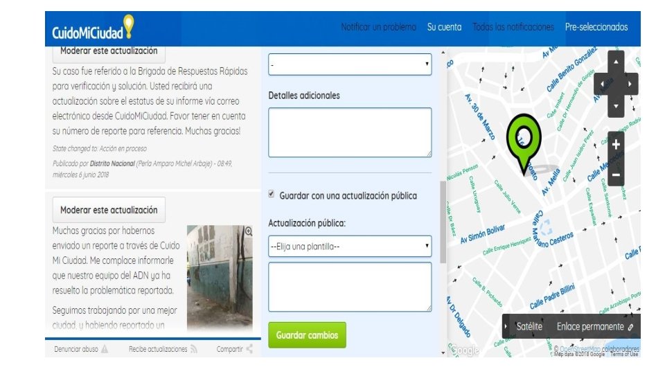 Después de que el ciudadano georeferencia la ubicación de su reporte, procede a proporcionar los detalles del mismo (resumen, fotografías, descripción detallada).