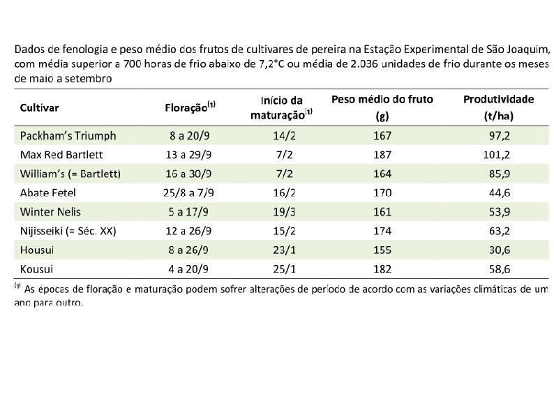 Cultivares de Pêra PERA ROCHA Variedade Portuguesa em forte expansão no Brasil. Tem ampla aceitação pelo consumidor brasileiro e internacional. Pelo seu sabor e aspectos distintos, atualmente não concorre com outras peras produzidas e importadas da América do Sul, principais fornecedores de peras para o Bras Aparentemente exige menos frio que outras variedades Européias. Maturação em fevereiro. Frutas doces, com características típicas, e alto valor de mercado. Produzimos mudas sobre Marmelo CV, para alta densidade de plantio, e sobre seleções de Caleriana. PERA PACKHAM'S TRIUMPH 2 Mutante de Packham’s Triumph selecionado pela CLONE VIVEIROS. Difere de Packham’s original pela maior intensidade de diferenciação de gemas florais e portanto maior produtividade. http: //cloneviveiros. com. br/site/Pera