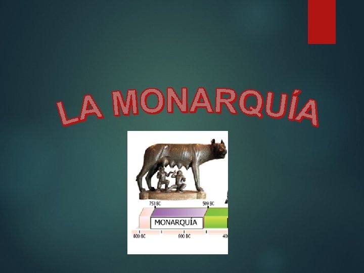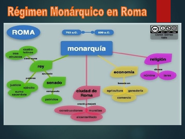 Régimen Monárquico en Roma Características generales. • El poder se concentra en manos del Rey, quien es jefe militar, civil y religioso. • El Senado (Consejo de Ancianos) y la Asamblea (comicios Curiados); Órganos consultivos del Rey. • La Clientela (o Sistema Clientelar) presente en las relaciones sociales. • Presencia exclusiva de Patricios en la Institucionalidad política. Mientras los Plebeyos carecen de toda participación.