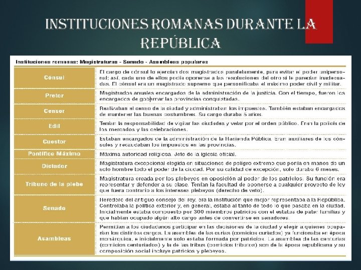 LA REPÚBLICA ROMANA • INSTITUCIONES ROMANAS. 1. -Magistraturas: • Cargos electivos, votados por las Asambleas. • Cargos temporales (normalmente un año) • Cargos colegiados (dos o más personas ). 2. - Senado: • Heredero del antiguo Consejo del rey. • Órgano supremo de gobierno. • Controlaba asuntos de política exterior. • Compuesto por Patricios. 3. -Asambleas. • Existentes desde el Régimen Monárquico. • Permitían la participación ciudadana. • Se elegían a los magistrados. • Composición social en la República: Patricios y Plebeyos. El senado romano