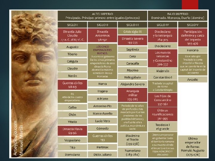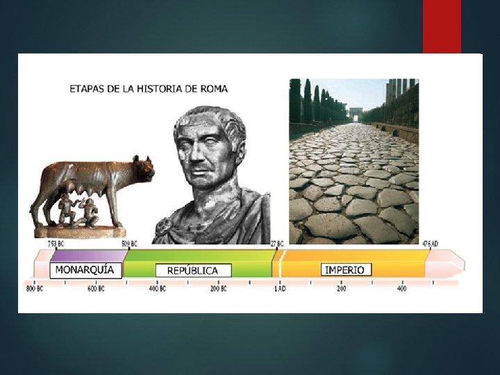IMPERIO (27 A. C. -476 D. C. ) • El emperador acumulaba todos los poderes: presidía el senado, era el jefe supremo del ejército y el pontífice máximo, dirigía la política exterior, dictaba las leyes, decidía los tributos y nombraba a su sucesor. • El senado se limitaba a ratificar las decisiones del emperador. • Durante los siglos I y II d. C. Roma consiguió su máximo esplendor y expansión con emperadores como Octavio Augusto, Trajano, Adriano y Marco Aurelio.