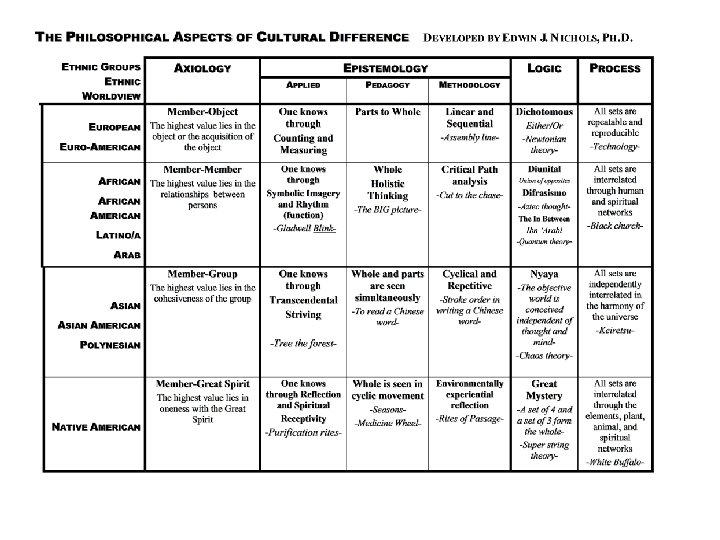 A) Nichols’ Model for Understanding Cultural Difference Philosophical Perspective on Cultural Difference. Edwin Nichols (cf. work of Jung) Different world cultures developed out of differing physical environments. These world views have differing constructs: § § Axiology (values) Epistemology (way of knowing) Logic (principles of reason) Process (practice of reason)