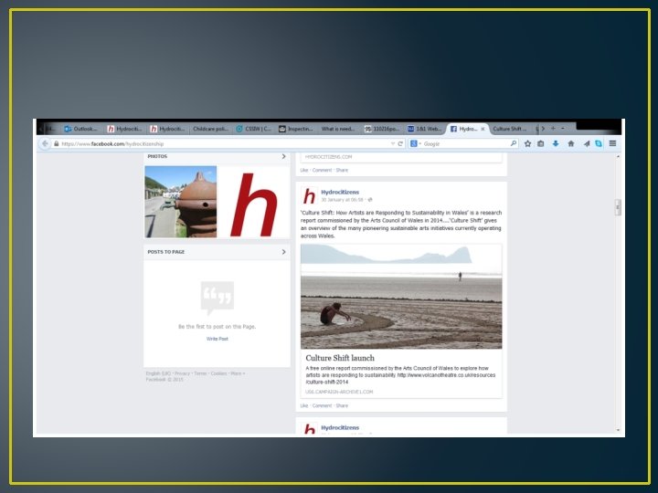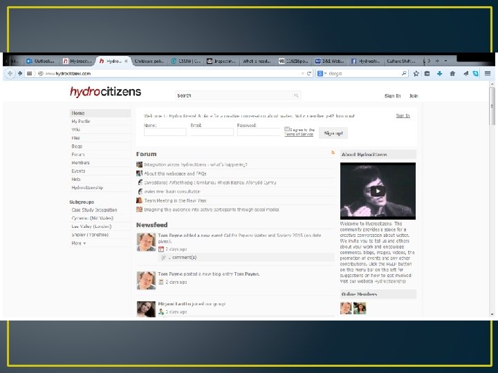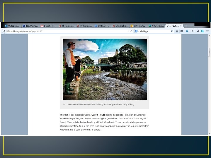 Introducing “Hydrocitizenship” http: //www. hydrocitizenship. com/ • A three year Arts and Humanities Research Council (AHRC) funded project involving many different universities, artists, community groups and academic disciplines. Part of AHRC “Connected Communities” programme “This 3 year project will investigate, and make creative contributions to, the ways in which citizens and communities live with each other and their environment in relation to water in a range of UK neighbourhoods…[enabling] creative conversations about. . . people and their diverse relationships with water, environment and non-human communities”