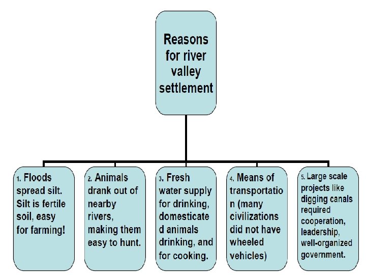 • Near a river • Temperate climate • Arable land • Abundance of food