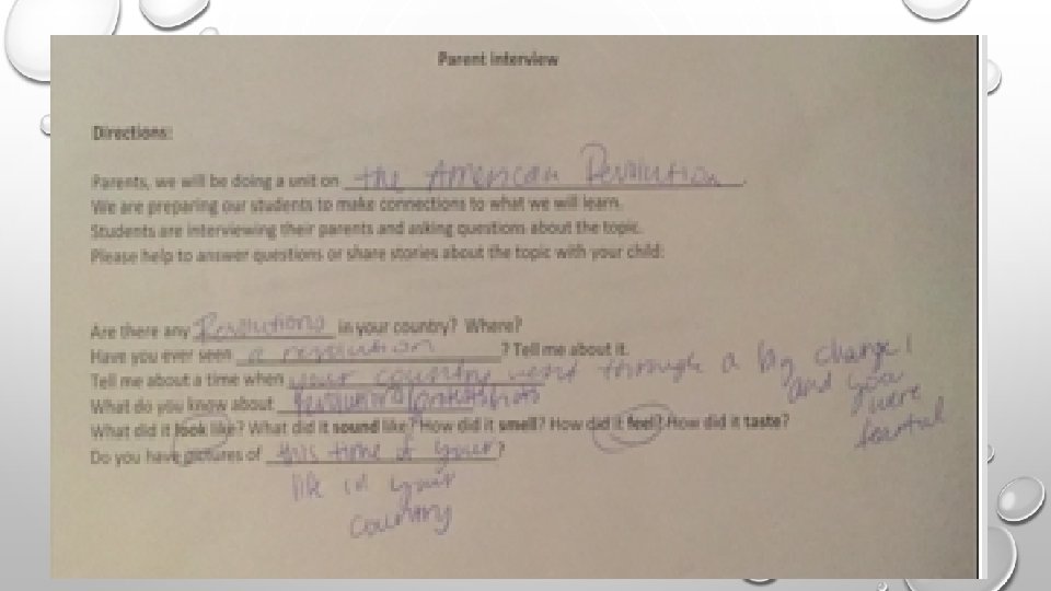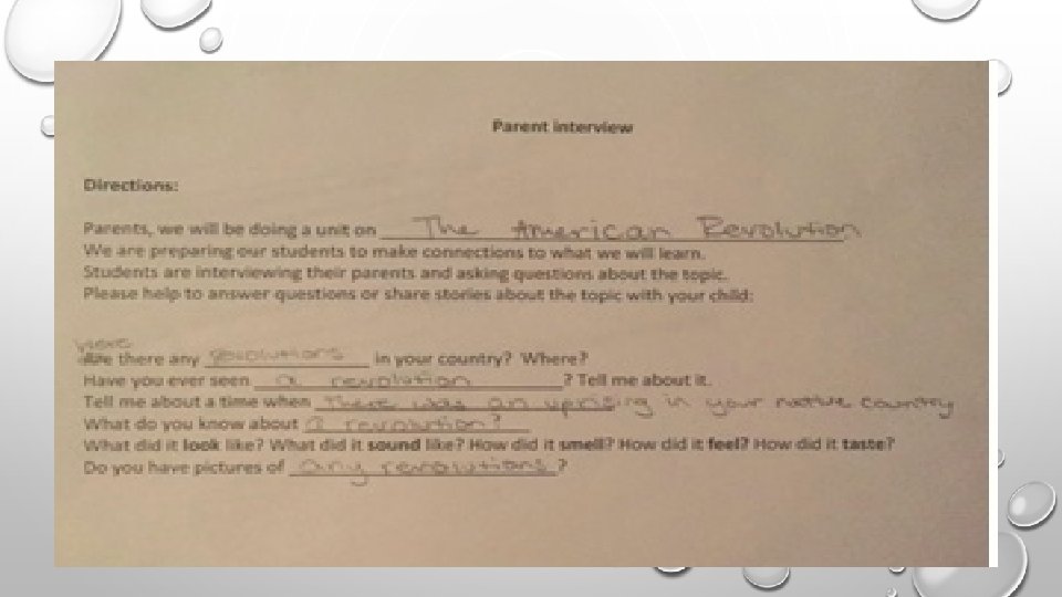 PARENT INTERVIEW DEAR PARENTS, WE WILL BE DOING A UNIT ON _______________ _. WE ARE PREPARING OUR STUDENTS TO MAKE CONNECTIONS TO WHAT WE WILL LEARN. STUDENTS ARE INTERVIEWING THEIR PARENTS AND ASKING QUESTIONS ABOUT THE TOPIC. PLEASE HELP TO ANSWER QUESTIONS OR SHARE STORIES ABOUT THE TOPIC WITH YOUR CHILD. • QUESTIONS • ARE/WERE THERE ANY ________________ IN YOUR COUNTRY? WHERE? HAVE YOU EVER SEEN ____________? TELL ME ABOUT IT. TELL ME ABOUT A TIME WHEN ____________ WHAT DO YOU KNOW ABOUT _______________ WHAT DID IT LOOK LIKE? WHAT DID IT SOUND LIKE? HOW DID IT SMELL? HOW DID IT FEEL? HOW DID IT TASTE? DO YOU HAVE PICTURES OF