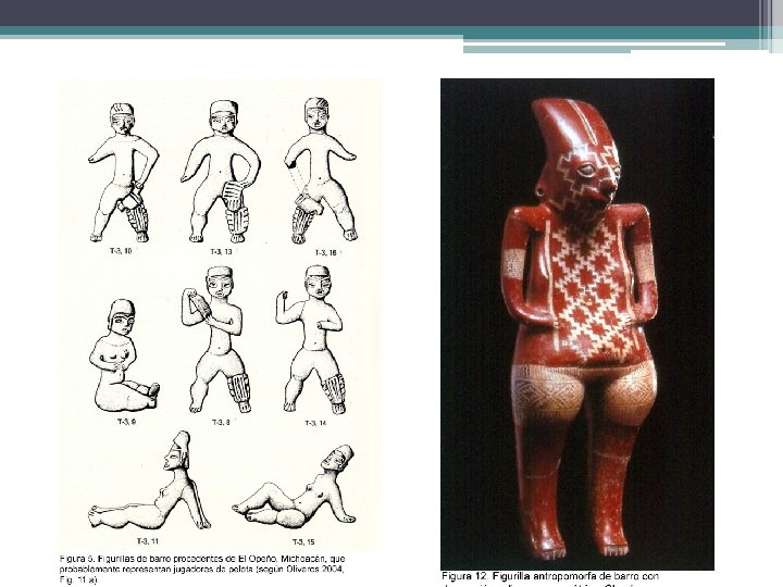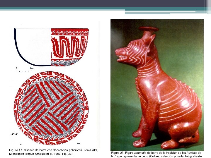 CERÁMICA • Mujeres �desnudas o con falda, bandas en la cabeza, argollas en nariz y aretes de concha. Decoraciones en los senos • Hombres �cubiertos de arriba y órganos genitales descubiertos o taparrabo • Perros �creencia en el viaje al mundo inferior con el perro como guía • Perro �alimento y compañía. Tamaño natural. Arcilla pulida roja/negra • Representación del perro en diferentes actividades: durmiendo, rodando, con huesos en hocico, ladrando, con máscara humana, con orejas perforadas, etc.