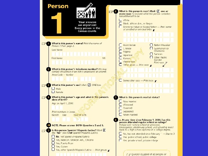 Categorization schemes (including race) are part of culture • they are learnable forms -- employing words like “white, ” “black, ” etc. • they travel through space and time • they undergo change in the course of their journey EXAMPLE: U. S. census questions