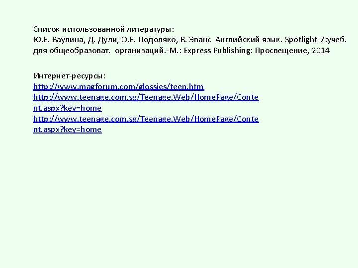 What do the teenage magazines have inside? 1. Articles about stars and celebrities 2. Articles about health/beauty 3. Articles about fashion 4. Famous people 5. Articles about sport/competitions 6. News 7. Problem pages 8. Quizzes 9. Horoscopes 10. Crosswords 11. Gossips