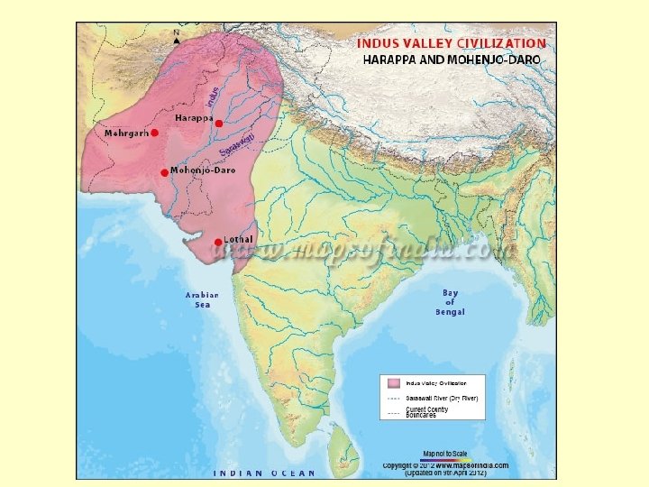 Indus Valley Civilization • Hunters and gathers: first people here • Farming communities came second – These communities grew into India’s first civilization. • Civilization started around 2500 BC when a system of writing was developed. – 2 large cities: Harappa and Mohenjo Darao • Sometimes called the Harappan civilization because of the ruins found. • Civilizations were carefully planned; suggesting a strong central authority. • Economy: focus on agriculture and trade. • Reasons for decline: flooding, disappearance of the river; invasion and disease.