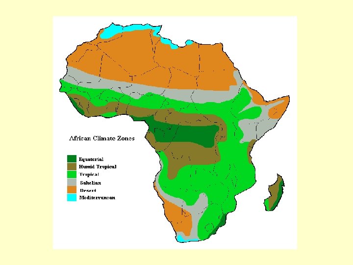Impact of Geography • Africa has four distinct climate zones: – Mild climate of the north: 10% – Sahara and Kalahari Deserts: 40% – Rain forest: 10% – Savannas: 40%