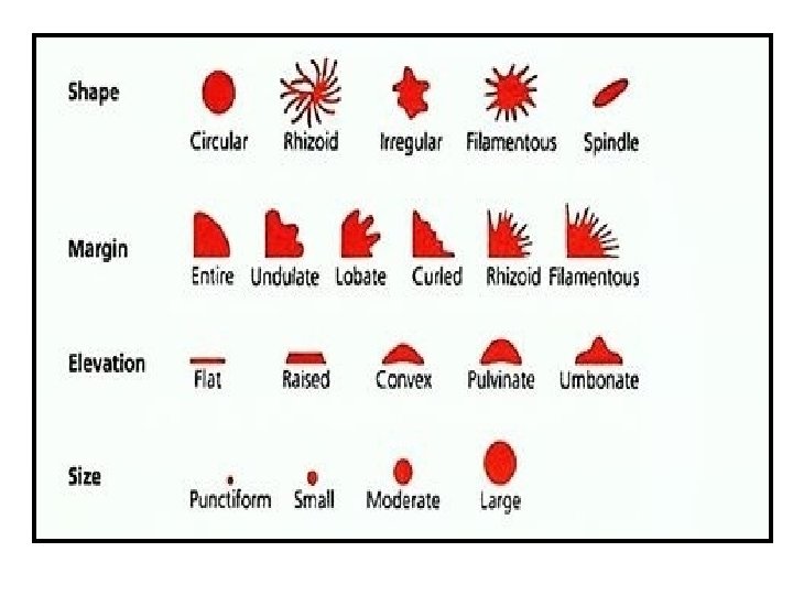 Bacterial Colony • Is a large number of bacterial cells on solid medium , which is visible to the naked eye as a discrete entity. • After incubation , the general form of the colony and the shape of the edge or margin can be determined by looking down at the top of the colony , the nature of the colony elevation is apparent when viewed from the side as the plate is held at eye level.