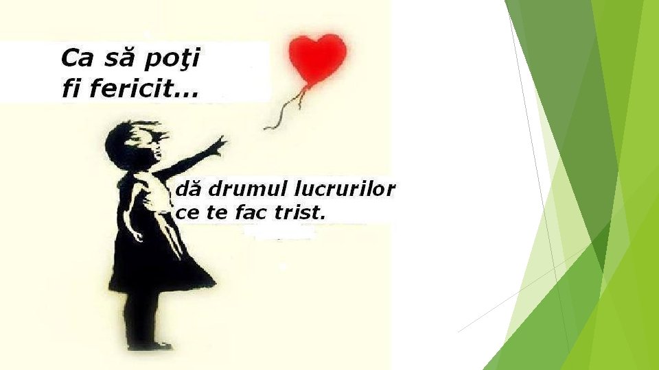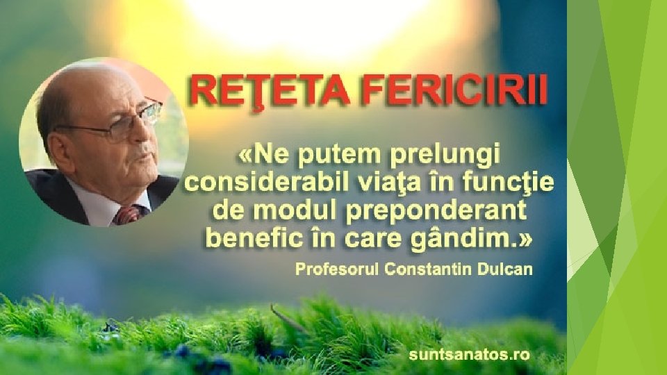 PASTILA PSIHOLOGICA A FERICIRII Fă ceea ce îţi place, dar care nu-ţi face rău! Fii implicat în proiecte personale! Construieşte-ţi o reţea socială minimală! Construieşte-ţi sens şi semnificaţie prin asumarea unor valori şi a unor relaţii transpersonale! Schimbă ceea ce nu îţi place! Acceptă ceea ce nu poţi schimba!