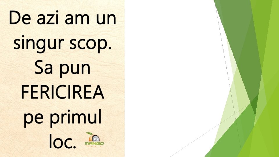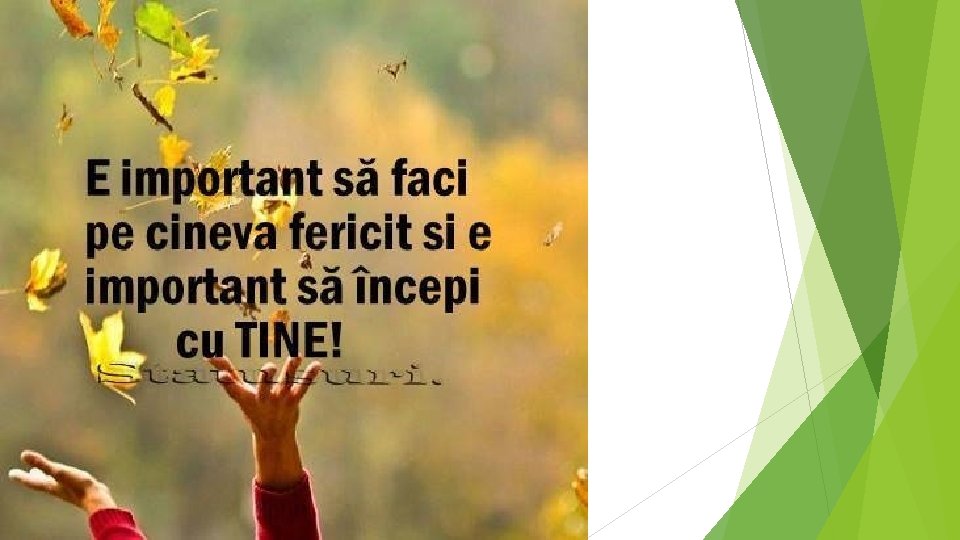 EXERCITII PENTRU FERICIRE Elaboraţi o listă de 10 comportamente care vă produc plăcere şi pe care le veţi face în următoarea lună Stabiliţi-vă ca scopuri personale: Îmbunătăţirea sănătăţii – Ce veţi face? . . Întărirea/dezvoltarea unor reţele sociale (inclusiv interacţiuni mai frecvente în familie) – Ce veţi face? . . . Implementarea unor proiecte realiste – Ce veţi face? . . Stabiliţi-vă scopuri transpersonale şi o grilă de valori: Dezvoltaţi sens şi semnificaţie prin religie şi/sau cultură – Ce veţi face? . . . . Precizaţi-vă grila de valori şi să o ştiţi precum propriul nume