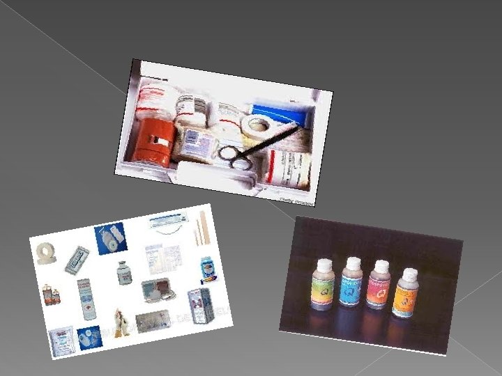 MATERIALES � � � Agua oxigenada. Solución útil para lavar las lesiones. Alcohol. Se usa para desinfectar instrumental y limpiar la piel, pero no es aconsejable emplearlo directamente en una herida porque irrita los tejidos. Algodón. Auxiliar en la limpieza de la piel y en la aplicación de antisépticos. Antisépticos. Sustancias que previenen infecciones al impedir el crecimiento de los gérmenes que comúnmente están presentes en toda lesión. Apósitos. Almohadillas elaboradas con gasa que sirven para cubrir las heridas desinfectadas. Compresa. Porción de gasa estéril lo suficientemente grande (30 a 40 centímetros) para que pueda extenderse más allá del borde de la herida o quemadura; asimismo, es útil para detener hemorragias. � � � � Crema para quemaduras. Sólo está indicada para las quemaduras que afectan la superficie de la piel, también denominadas de primer grado. . Gasas estériles. Se usan para limpiar y cubrir heridas. Hisopos. Son útiles para extraer cuerpos extraños, limpiar heridas y aplicar antisépticos en cavidades. Suero fisiológico o solución salina normal. Sirve para limpiar o lavar heridas y quemaduras. Vendas. Hay de distintos tamaños y llegan a ser necesarias para mantener apósitos y compresas sobre las heridas y quemaduras. Vendas adhesivas. Se emplean para cubrir lesiones pequeñas. Telas adhesivas. Permiten fijar en la piel gasas, apósitos, compresas y vendas